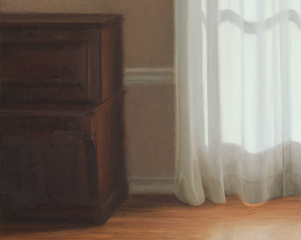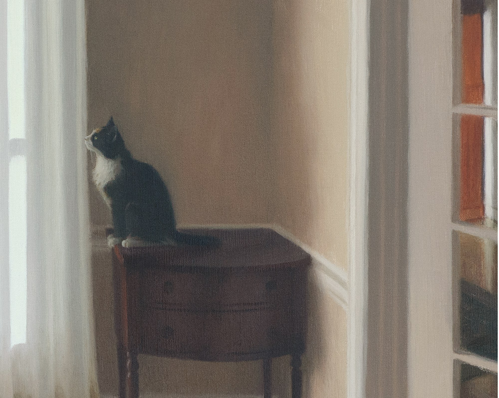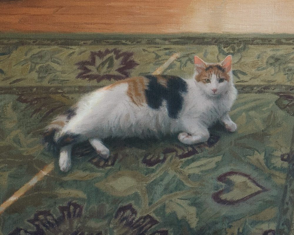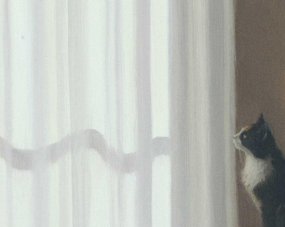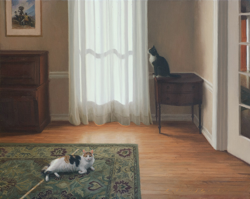 In this quiet little domestic episode, our upper right kitty became fascinated by a small moving shadow on the drapes. "Events" unfolded for nearly half an hour, and the fact that sister cat was uninterested only added to its charms. The smallness and the quiet of it all became an inspiration impossible to resist.