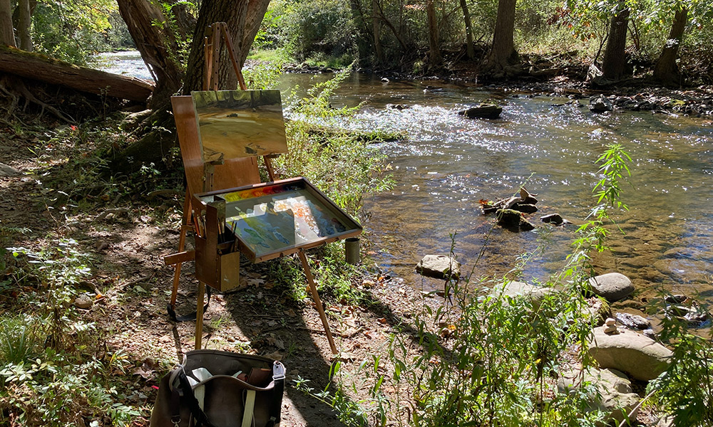 There's an unusual story that goes with the beginning of this piece. When I began sketching it in, a wasp stung me on the back, which inspired me to notice the upset hive about 6 feet behind me under some tree roots. When I came back this year, the hive had apparently moved elsewhere. My comedy brain still couldn't resist wasp children saying: "Daddy, tell us the story of you stinging the artist again!" |