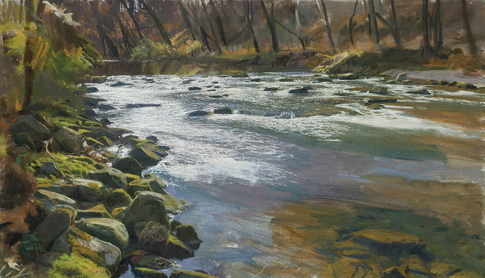 The windows for working on this piece for the day and the year are both a little short. It's after the leaves have mostly fallen, and before the arc of the sun gets so low it fades behind the distant trees. It sure is wonderful while it lasts though, and I appreciate trying to paint this spot of brightness in the dim part of the year. |