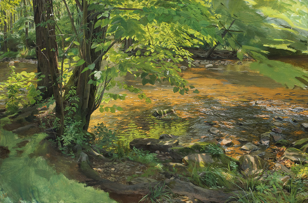 The paradox of this painting is the pairing of its inherent tranquility with the exhileration of chasing after the light effects that are a little dramatic and somewhat brief. I use my normal approach, which includes the idea that whatever doesn't flow off the brush quite right today, can be revisited tomorrow, or as many tomorrows as are needed. I will look forward to more of those days when summer returns. |