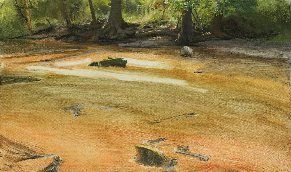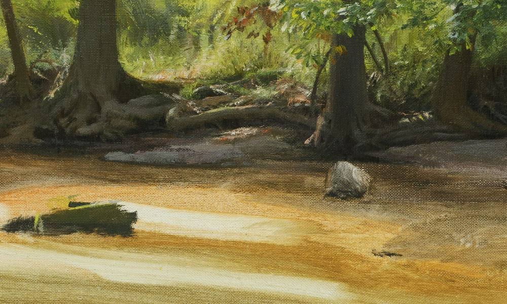 There's an unusual story that goes with the beginning of this piece. When I began sketching it in, a wasp stung me on the back, which inspired me to notice the upset hive about 6 feet behind me under some tree roots. When I came back this year, the hive had apparently moved elsewhere. My comedy brain still couldn't resist wasp children saying: "Daddy, tell us the story of you stinging the artist again!" |